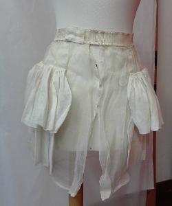 Sottostruttura per abbigliamento femminile composta da fascia in vita realizzata con diversi tipi di nastro di cui uno recante la scritta "Sartoria Ventura Milano" e balze in organza di seta.\nChiusura anteriore con gancetti sulla fascia in nastro e sei bottoni automatici di cui tre mancanti.