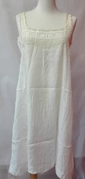 Sottoveste di tela di lino bianco con spalline e scollo bordate da merletto a fuselli meccanico. \nFascia passanstro ricamata a giorno mancante del nastro, intarsio a filet e iniziali ricamate "BL";