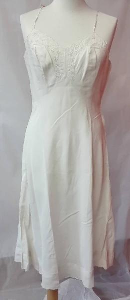 Sottoveste in crespo di seta bianco con spalline a nastro realizzate con una seta diversa da quella della sottoveste. \nscollatura a V nella parte anteriore, decorata con un ricamo a giorno e a punto pieno, a motivo floreale. \nUno smerlo profila lo scollo e il bordo inferiore.
