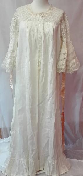 Camicia da notte in tela di lino bianca con ampi intarsi in merletto a fuselli meccanico sul carrè dell'abito. \nchiusura anteriore con cinque bottoncini in madreperla, ai lati piccolo motivo plissettato. \nManica a tre quarti decorata da merletto a fuselli, passanastro con ricamo a giorno e a punto pieno. \nBalza al fondo profilata nella parte superiore con un piccolo motivo a jour e con plissettature nella parte inferiore. \nSul dorso, ricamo a punto pieno "Elmina"