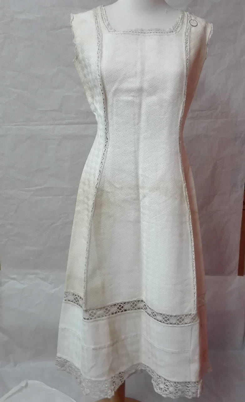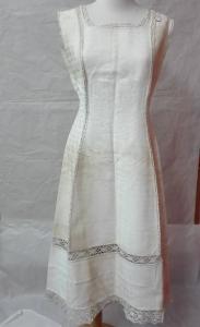 Sottabito in piquet bianco lavorato con motivo di rombi, decorato allo scollo, al giromanica e al fondo con pizzo a fuselli di Cantù. Intarsi verticali in pizzo a fuselli di Cantù. \nchiusura posteriore con sette bottoni.