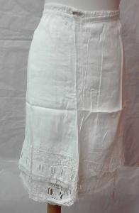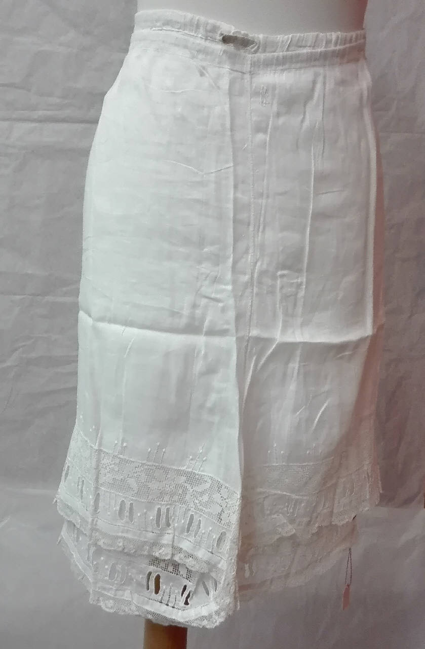 Mutande di tela di cotone bianca arricciata con elastico in vita, parte inferiore decorata con incassi in filet ricamato, ricami a giorno e ruches in pizzo valenciennes; passanastro senza nastro. \nin vita, nella parte anteriore monogramma "LB".