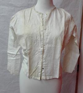 Copribusto in tela di cotone bianco a manica lunga con allacciatura anteriore a cinque bottoni in madreperla di cui uno automatico (sostituito); \npiccola guarnizione di merletto a fuselli allo scollo; le spalle e il giromanica sono uniti con punto a giorno che crea una piccola decorazione, gli orli sono decorati con un minuto ricamo a picot.\nProbabile realizzazione domestica.