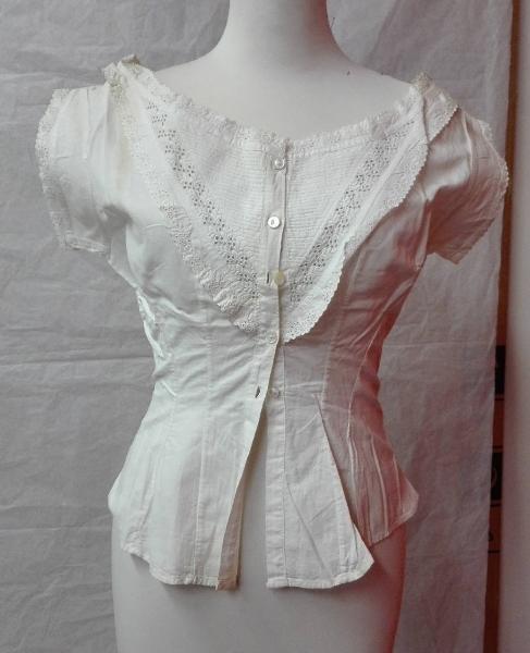 Corpibusto in tela di cotone bianco con sul fronte motivo a V creato da un intarsio in broderie anglaise e un motivo plissettato; \nallacciatura anteriore con cinque bottoni in madreperla.