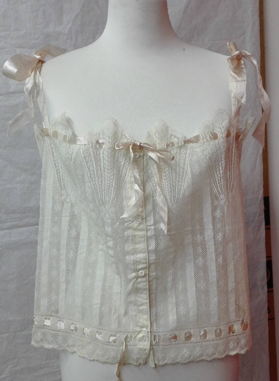 Corpibusto in pizzo a fuselli meccanico, allacciatura frontale centrale a quattro bottoni in madreperla. \npizzo con motivo floreale stilizzato; spalline in nastro di seta rosa; passanastro sia allo scollo che all'orlo inferiore con nastro di seta rosa.