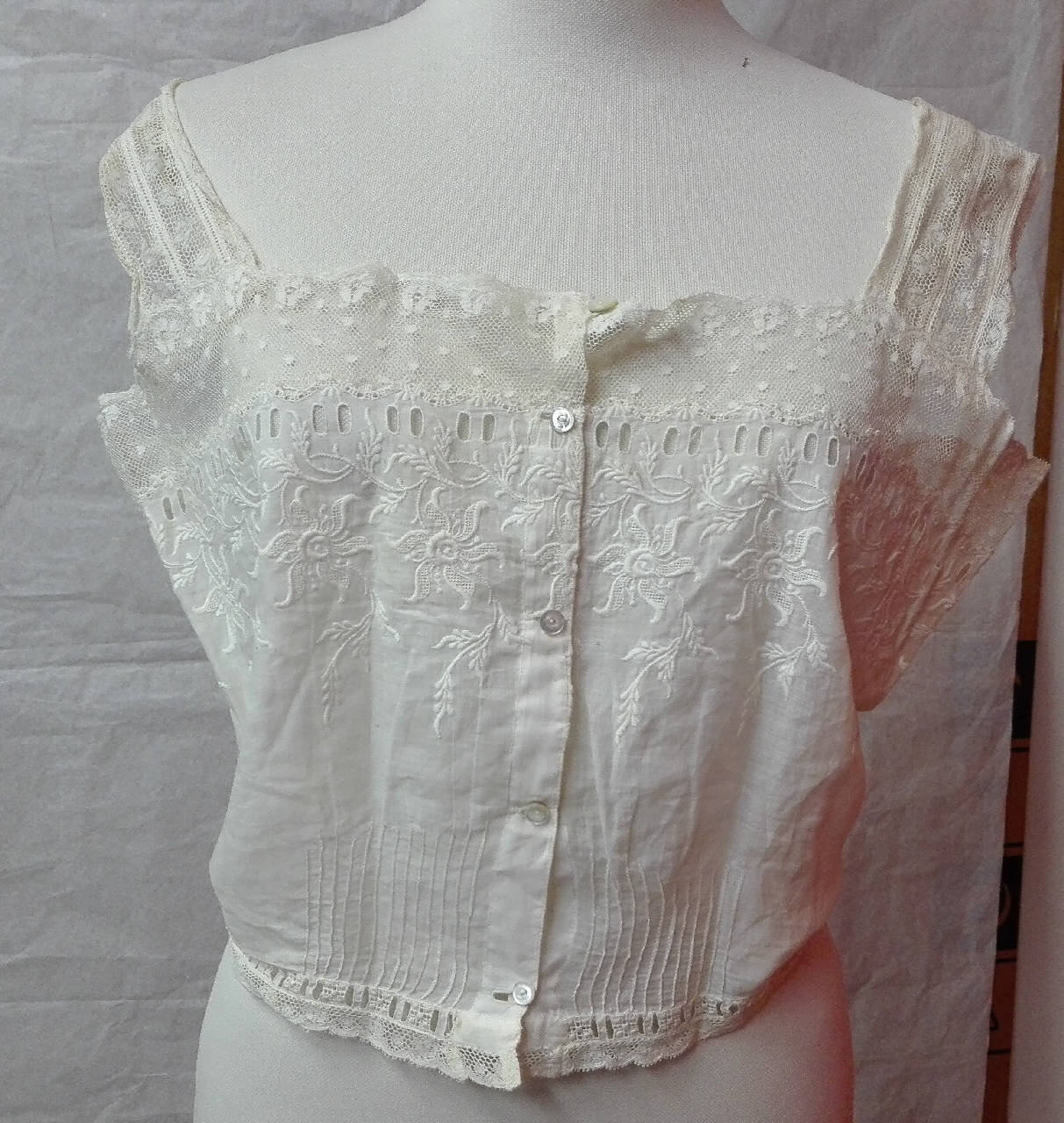 Copribusto in tela di cotone bianco con allacciatura anteriore a cinque bottoni di madreperla. \nscollo e spalline in merletto a fuselli meccanico. \ncorpino decorato con un ricamo a motivo floreale a punto pieno e retini. \nnella parte inferiore, motivo di piegoline verticali, passanastro allo scollo e in vita (senza nastro). \norlo inferiore con bordino in pizzo a fuselli.\nmonogramma "A" ricamato a punto scritto sul retro del bustino.