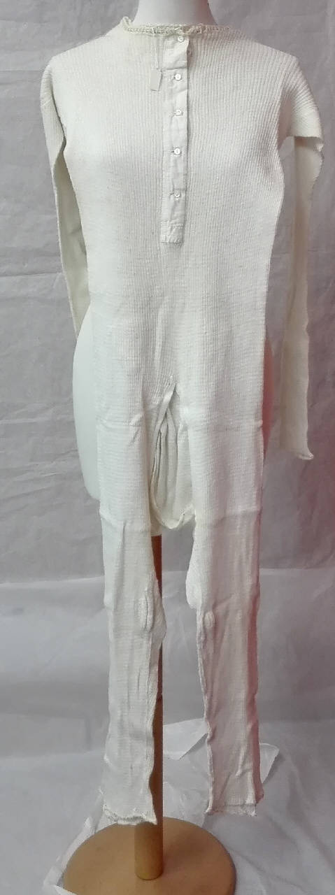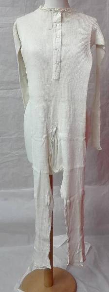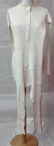Combinazione con manica e gamba lunga in maglina di lana con motivo a costine; apertura al cavallo sovrammessa. \nallacciatura anteriore con cinque bottoncini in madreperla.\npiccolo passanastro con guarnizione a punto catenella sullo scollo e stessa guarnizione al fondo delle gambe.