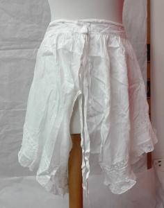 Mutande in tela di cotone bianco completamente aperte al cavallo, chiuse in vita da lacci; all'orlo inferiore passanastro (senza nastro) e intarsio e volant in pizzo a fuselli meccanico.\nsul retro monogramma con medaglione e ricamo "M".