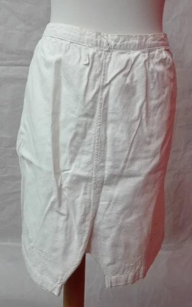 Mutande di tela di cotone bianca con chiusura ai fianchi con lacci; all'orlo inferiore motivo ricamato di sfilato a giorno e intagli a motivo floreale. \nmanifattura domestica.
