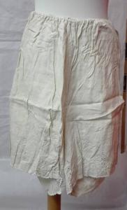 Mutande in tela di lino non sbiancato con elastico in vita (probabilmente posteriore); \nal fondo decorazione con motivi geometrici a giorno e piccolo motivo floreale stilizzato ad intaglio. \nsmerlatura a punto festone all'orlo.\nricamo "IDA" sul bordo superiore frontale.