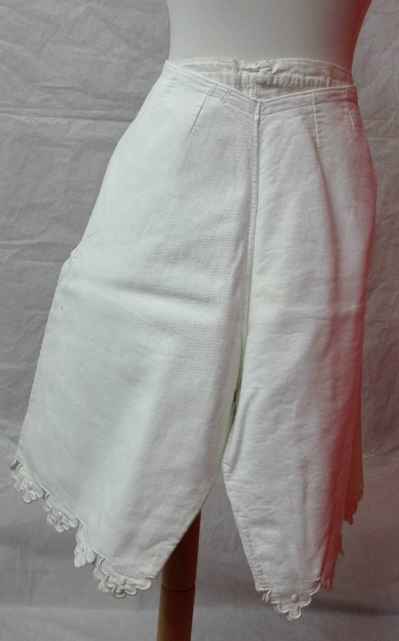 Mutane in diagonale di cotone felpato bianco, chiuse in vita da lacci; \norlo al fondo centinato ricamato a punto festone e con pois a punto pieno.\nmonogramma ricamato "E"