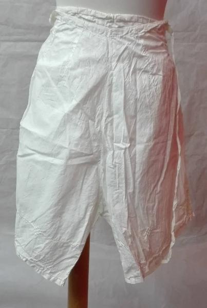 Mutanda di tela di cotone bianco chiusa in vita da lacci e bottoni; \nal fondo, sui fianchi, medaglione intarsiato a filet incorniciato da sfilature a giorno; \naltre sfilature a giorno profilano la parte inferiore insieme a una decorazione geometrica realizzata a motivo di scacchiera realizzata a punto ombra imbottito.