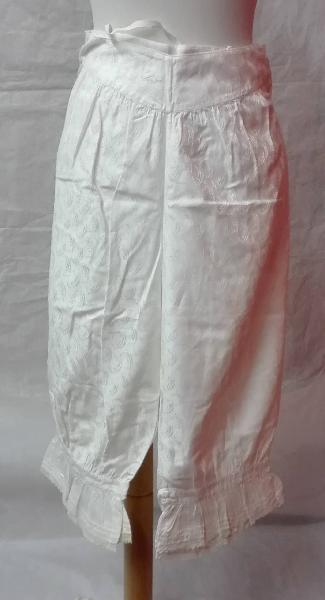Mutande lunghe in tessuto operato di cotone bianco chiuse in vita con bottoni laterali e coulisse posteriore.\nal fondo balza decorata con motivo a piccole pieghine orizzontali e merletto a fuselli meccanico.\niniziali ricamate in vita a punto erba "AF"