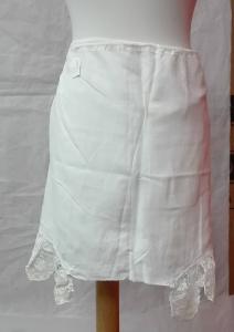 a) mutande corte in batista di cotone bianco chiuse in vita con coulisse; \nsul fondo orlo a giorno e pizzo a fuselli meccanico con passanastro (senza nastro) \nb) mutande corte in batista di cotone bianco chiuse in vita con coulisse; \nal fondo orlo a giorno e balza in garza di cotone bianca decorata con smerlature a punto festone e pois a punto pieno. \nc) lunghe mutande in cotone operato bianco a costine; chiusura in vita con lacci; completamente aperte al cavallo.\nal fondo decorazione con merletto all'uncinetto.