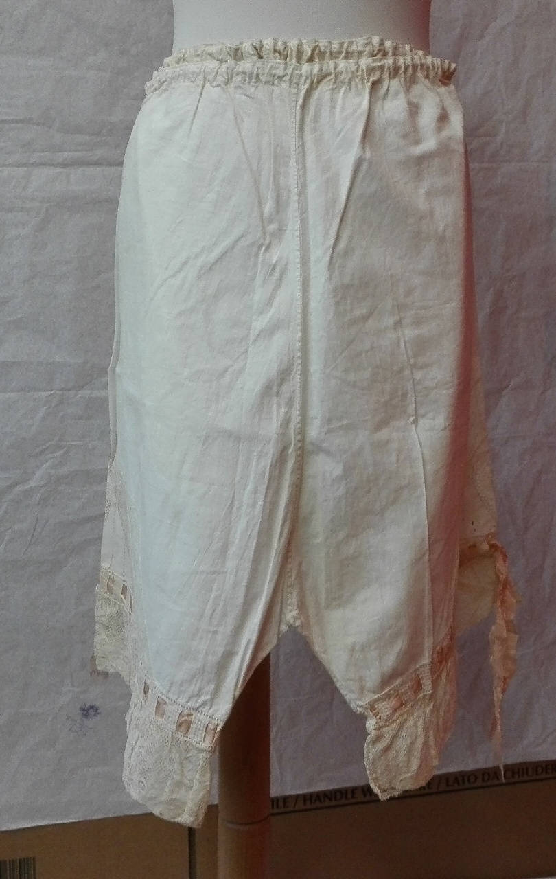 a) mutande in tela di cotone bianca con falsature in merletto a fuselli meccanico, broderie anglaise e sfilature a giorno. \npassanastro con nastro in diagonale di seta rosa e orlo finale decorato con balza in merletto a fuselli meccanico.\nchiusura in vita con elastico (probabilmente posteriore).\nb) camicia da notte in tela di cotone bianco sorretta da spalline con falsature in merletto meccanico che creano un motivo a V sul carrè; \nintarsi con broderie anglaise e sfilature a giorno nella parte centrale della decorazione. \nlo scollo è decorato da un passanastro con nastro in seta rosa e merletto della stessa foggia delle falsature. \nspalline profilate da tela di cotone bianca (probabilmente applicata posteriormente)