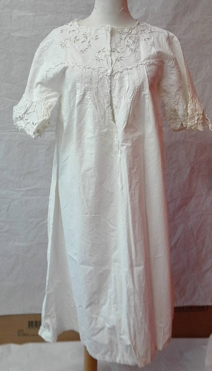 a) Camicia da notte in tela di cotone bianca ricamata sul carrè fronte e retro e sulla gala delle maniche a punto intaglio con motivi floreali. \nchiusura frontale con quattro bottoni in madreperla; girocollo, orlo delle maniche e orlo dell'apertura decorati con piccoli smerli a punto festone. \nsul fronte e sul retro, al centro, motivo di piegoline verticali.\nb) matinèe in tela di cotone bianco con maniche a tre quarti aperte sul braccio e decorate con smerli a punto festone e passanastro (mancante del nastro);\nchiusura frontale a tre bottoni in madreperla e asole a punto festone, nascosti dal bordo smerlato. \ndecori a motivi floreali realizzati a punto intaglio e punto pieno sul girocollo, sia sul fronte che sul retro, sulle maniche e sui bordi inferiori delle punte del corpetto.