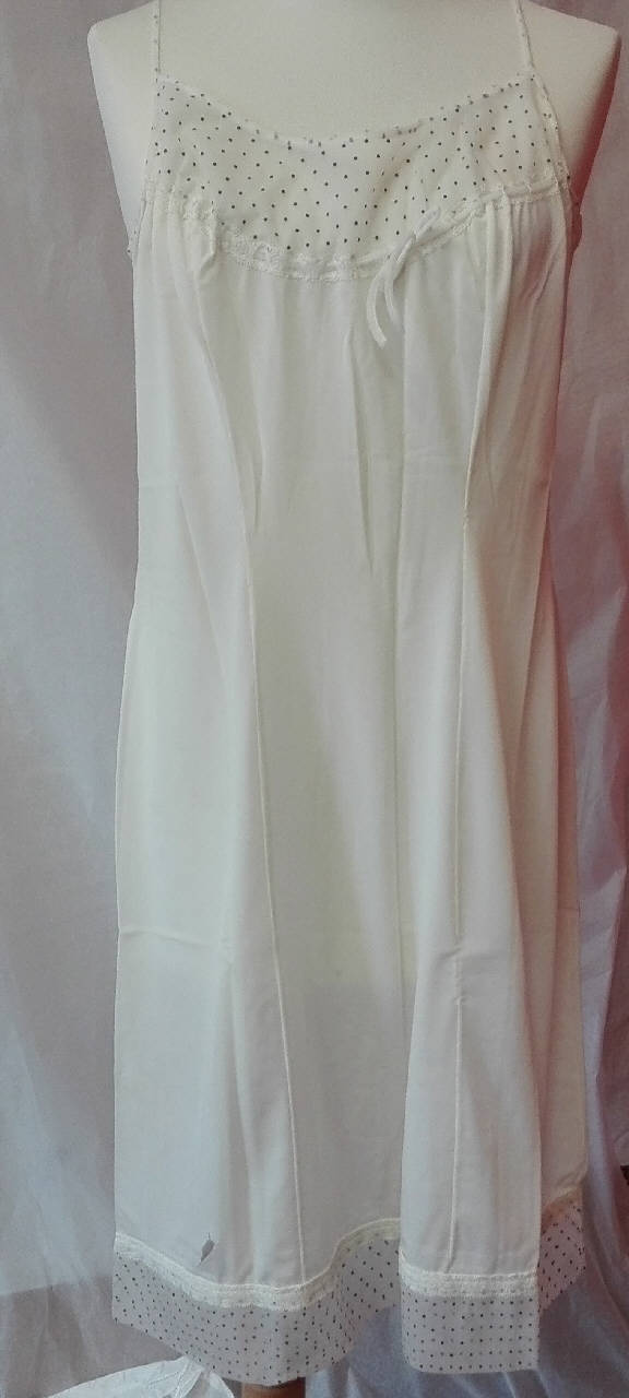 Sottoveste di materiale sintetico bianco sostenuta da spalline, coulisse profilata da merletto; scollo decorato da un bordo di materiale sintetico con motivi di pois neri su fondo bianco. \nlo stesso bordo si ritrova anche all'orlo inferiore con la stessa decorazione di merletto