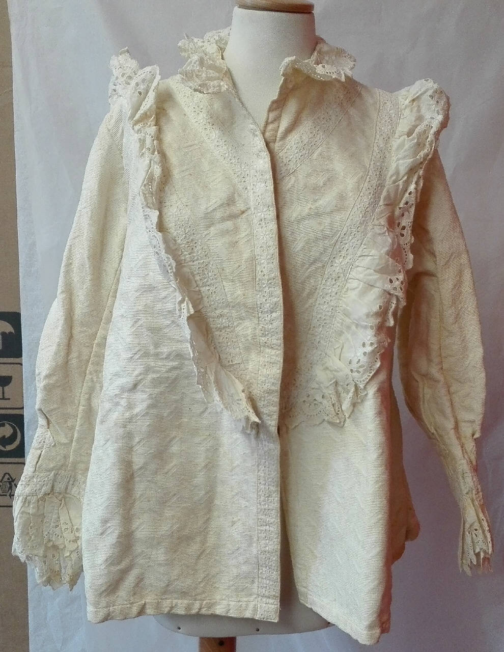 Giacchino in cotone felpato, colletto montante profilato da balza in Sangallo; maniche lunghe arricciate sulle spalle, polsi in Sangallo. \nchiusura anteriore a sei bottoni. \nbalza in Sangallo che forma un motivo a V che prosegue anche sulle spalle.\netichetta con monogramma "SB" in rosso.