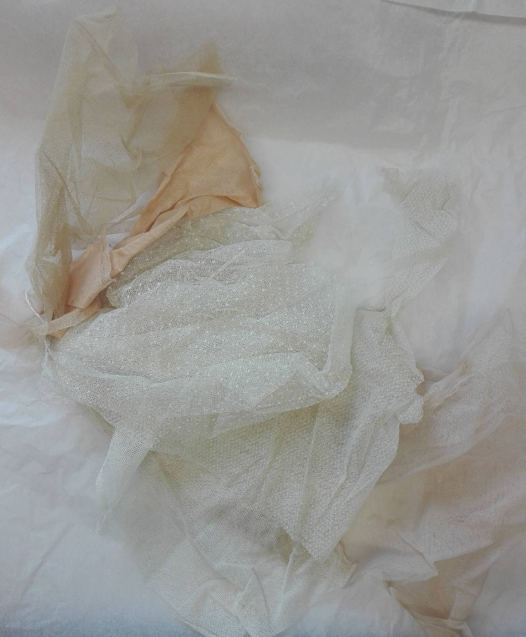 Sei campioni di tulle meccanico di cotone in colori vari, dal bianco al rosa al color champagne.\ni due bianchi presentano un piccolo motivo decorativo a pois.