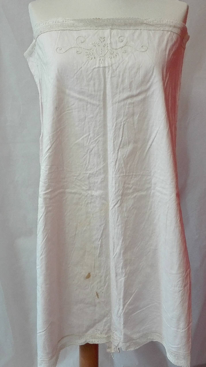 Combinazione in tela di cotone color rosa pallido con ricami in seta a punto pieno e punto erba e bordo in pizzo che decora tutto lo scollo e l'orlo inferiore. \nChiusura inferiore a due bottoni. \nSpalline mancanti. \nArricciature create con pieghe sui fianchi.