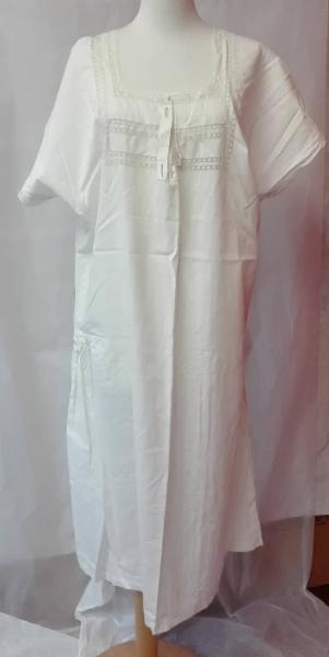 Camicia da notte a manica corta in tela di cotone bianco con falsature in merletto meccanico sul carrè e sul retro. \nApertura frontale con passanastro (nastro mancante) e presenza di monogramma "G" ricamato sul fronte.\nPresenza di arricciature create da piccole pieghe sui fianchi.