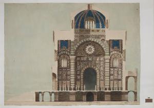 Disegno su carta ad acquerello, matita grafite, gouache acquerellata, china e biacca raffigurante la sezione longitudinale del Famedio del Cimitero Monumentale di Milano.