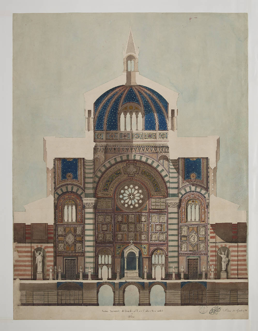 Disegno su carta ad acquerello, matita grafite, gouache acquerellata, china e biacca raffigurante la sezione trasversale del Famedio del Cimitero Monumentale di Milano.