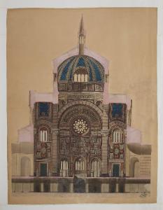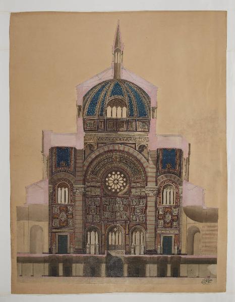 Disegno su carta ad acquerello, matita grafite, gouache acquerellata, china e biacca raffigurante la sezione longitudinale del Famedio nel Cimetero Monumento di Milano.