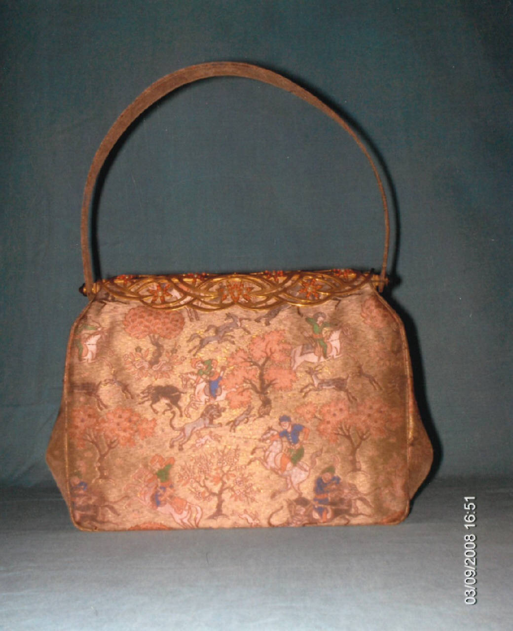 Borsetta in tessuto lamé oro con cerniera di fabbricazione francese traforata e incisa a mano con cabochons bianchi e rossi.