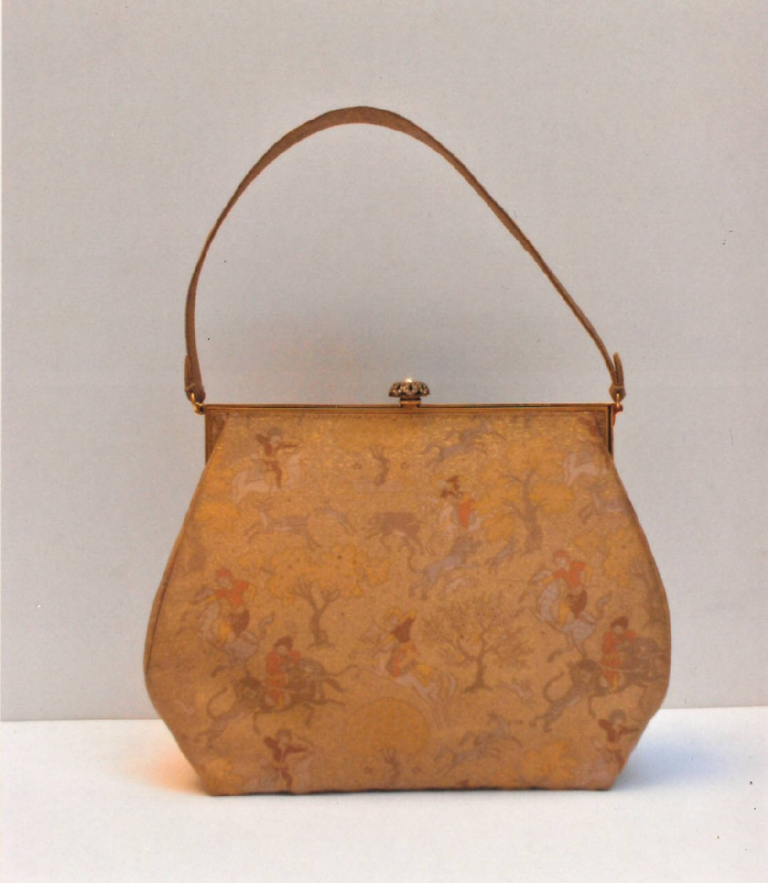 Borsetta tessuto lamé oro della ditta Bianchini-Férier, cerniera ditta Galloise, guilloché dorata, saltarello marcassites e perla.