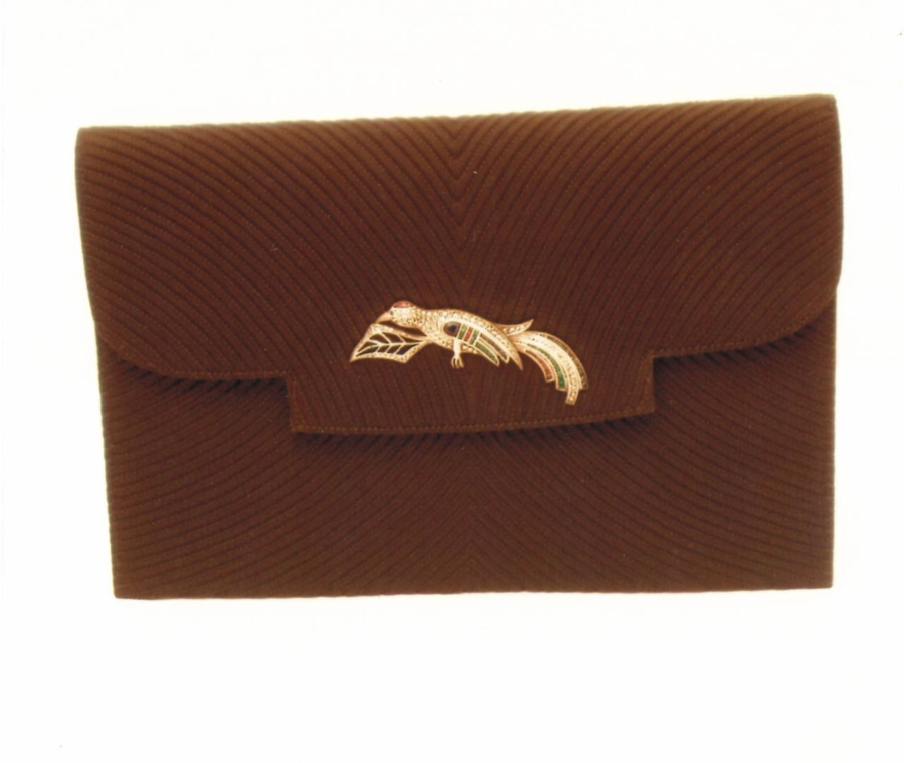 Borsa di tipo sachet in tessuto cordonato, il pavone che lo guarnisce è una spilla anni 1920/1930 adattata alla borsa.