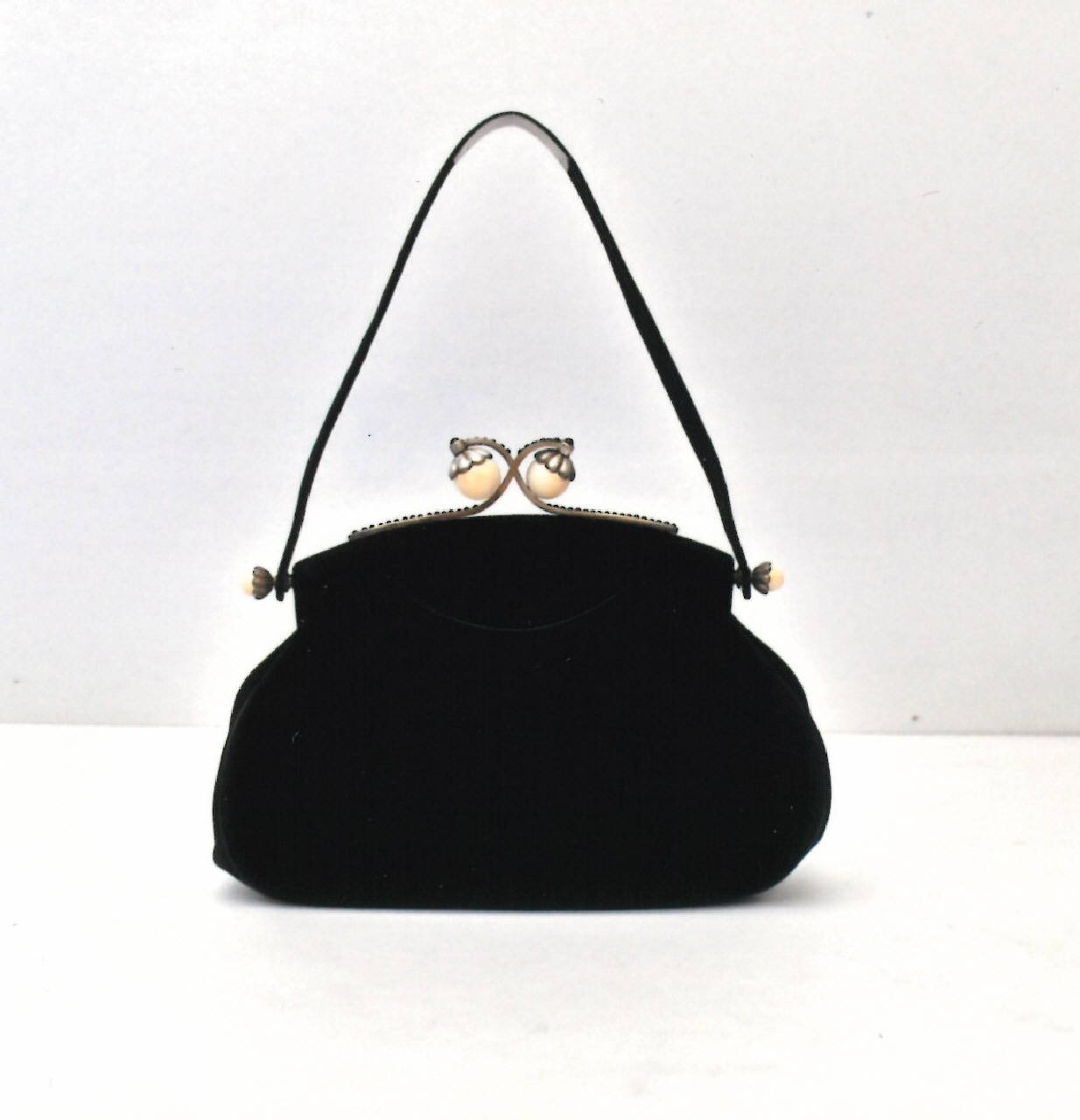 Borsetta in pelle di camoscio nera, cerniera in argento, cabochons neri con sferette avorio