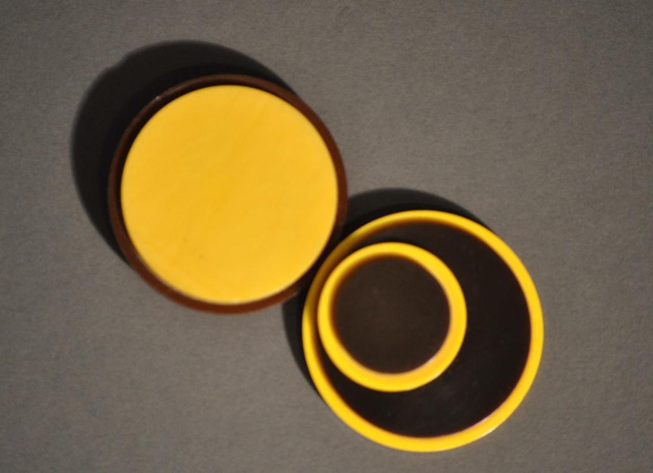 Fibbia in forma composta corpo in galalite in due pezzi. Ciascuna circolare, uno in galalite marrone decorato da un'applicazione, anch'essa circolare, di raggio leggermente minore, in galalite gialla; l'altro in galalite marrone, decorato da un'applicazione composta da tre cerchi digradanti e sovrapposti, in galalite gialla e marrone alternati. Passanti e ganci in metallo cromato.