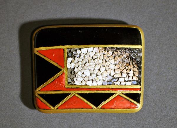 Decorazione di forma rettangolare. Corpo in galalite nera. Faccia incisa e dipinta a motivi geometrici e greche, in arancio e oro, con motivo centrale rettangolare ornato con applicazioni in guscio d'uovo craquelé. Passanti in metallo dorato.