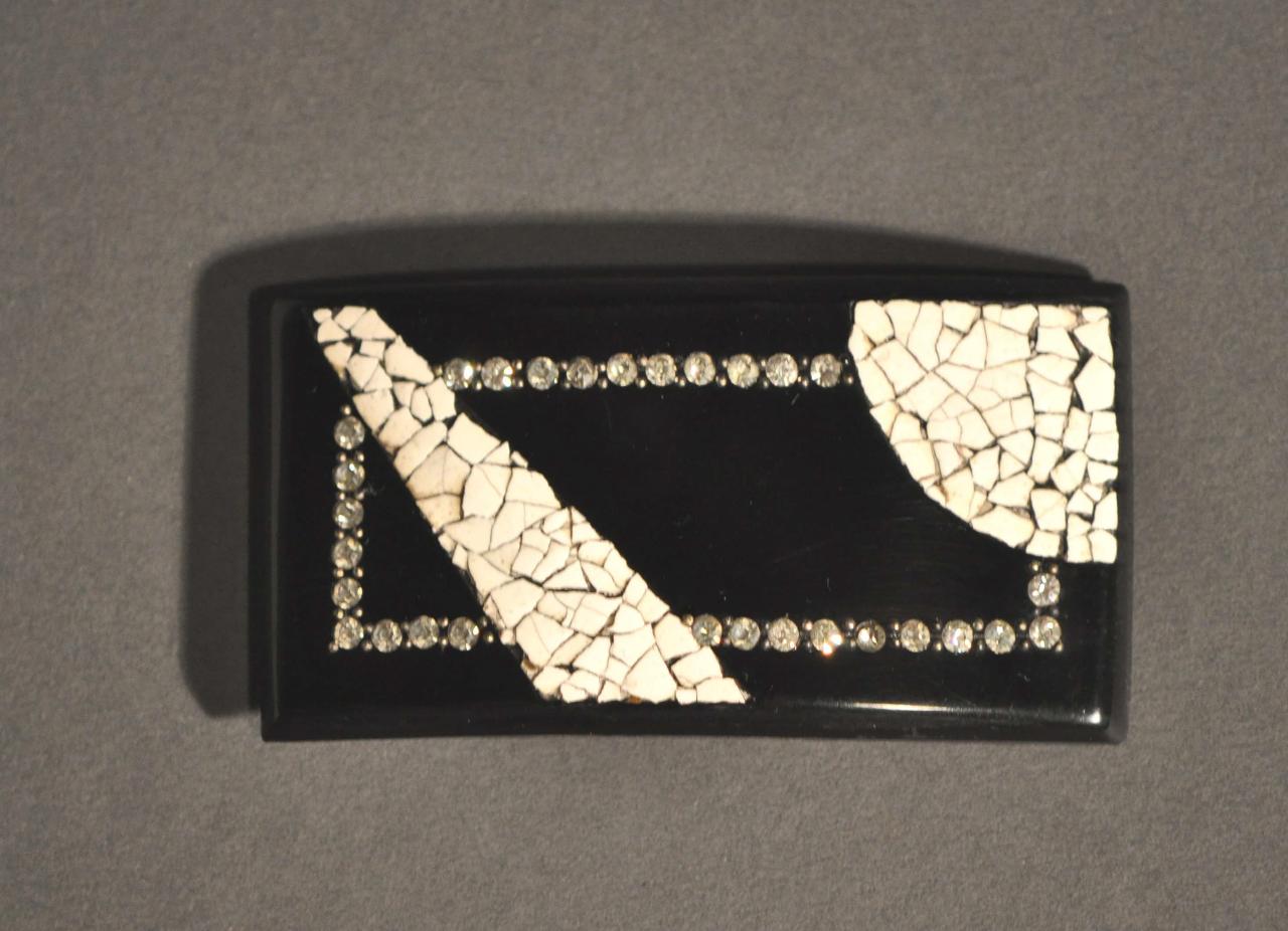 Decorazione di forma rettangolare. Corpo in galalite nera. Faccia incisa e decorata con applicazioni in guscio d'uovo craquelé e piccoli strass incolori che creano, alternati a borchiette metalliche abbinate, una greca centrale rettangolare. Passanti in metallo dorato.