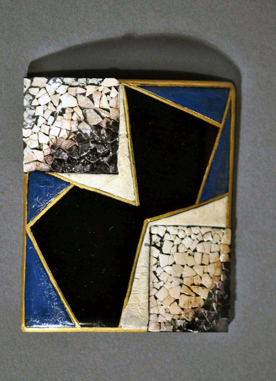 Decorazione di forma rettangolare. Corpo in galalite nera. Faccia incisa e dipinta in nero, blu e bianco, a motivi geometrici quadrangolari e triangolari intersecantesi, decorata con applicazioni in guscio d'uomo craquelé. Passanti in metallo dorato.