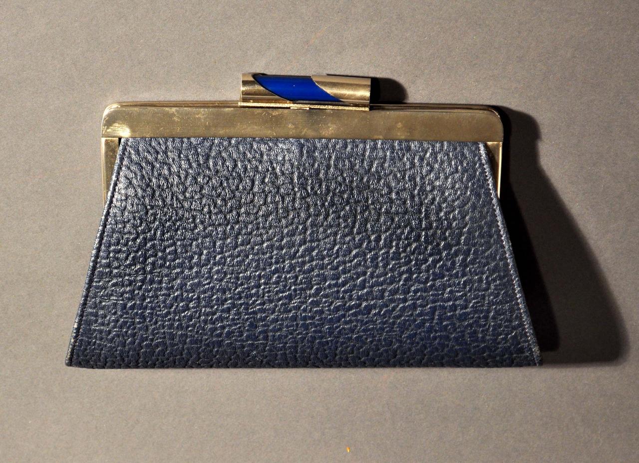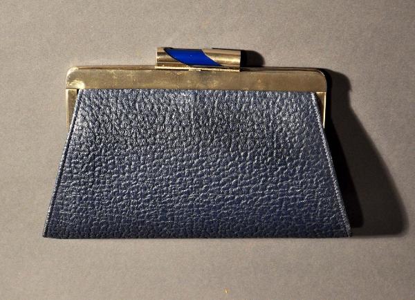 Borsa da giorno in vitello palmellato blu; cerniera in metallo cromato; chiusura «a saltarello» in metallo cromato e galalite blu; piccola maniglia cucita sul retro. Interno foderato in seta grigio perla con portamonete centrale realizzato nel medesimo tessuto, cerniera in metallo e chiusura a scatto, foderato in seta bianco avorio; taschina cucita.