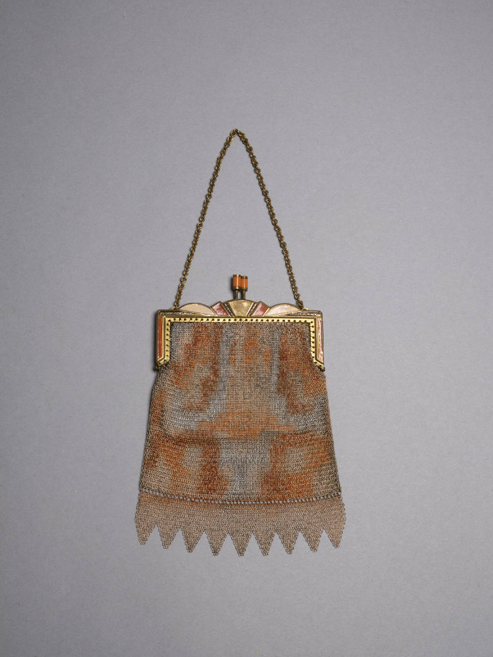 Borsa da sera in maglia metallica con bordo inferiore a losanghe laccata nei toni dell'arancio a creare motivo decorativo astratto; cerniera in metallo dorato sagomana a creare motivi decorativi geometrici art déco laccata nei toni arancio e rosa; chiusura a scatto in metallo dorato e bachelite arancio. Manico a catenella metallica dorata. Fodera in seta crema. É presente la marcatura «MADE IN GERMANY».