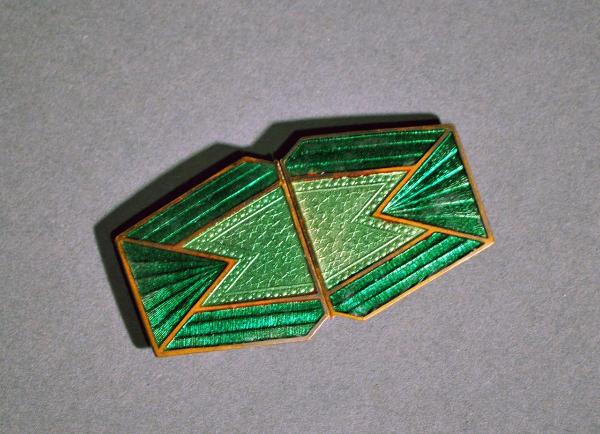 Fibbia a fermaglio da cintura, di forma composta. Corpo in bronzo argentato, in due pezzi. Ciascuno sagomato a guisa di esagono irregolare, fascia esterna metallica, porzione intermedia a motivi geometrici; smaltati a «basse taille» in diversi torni di verde su fondo operato a motivi geometrici, piccole stelle stilizzate e fascia perlinata. Passanti e ganci in bronzo argentato.