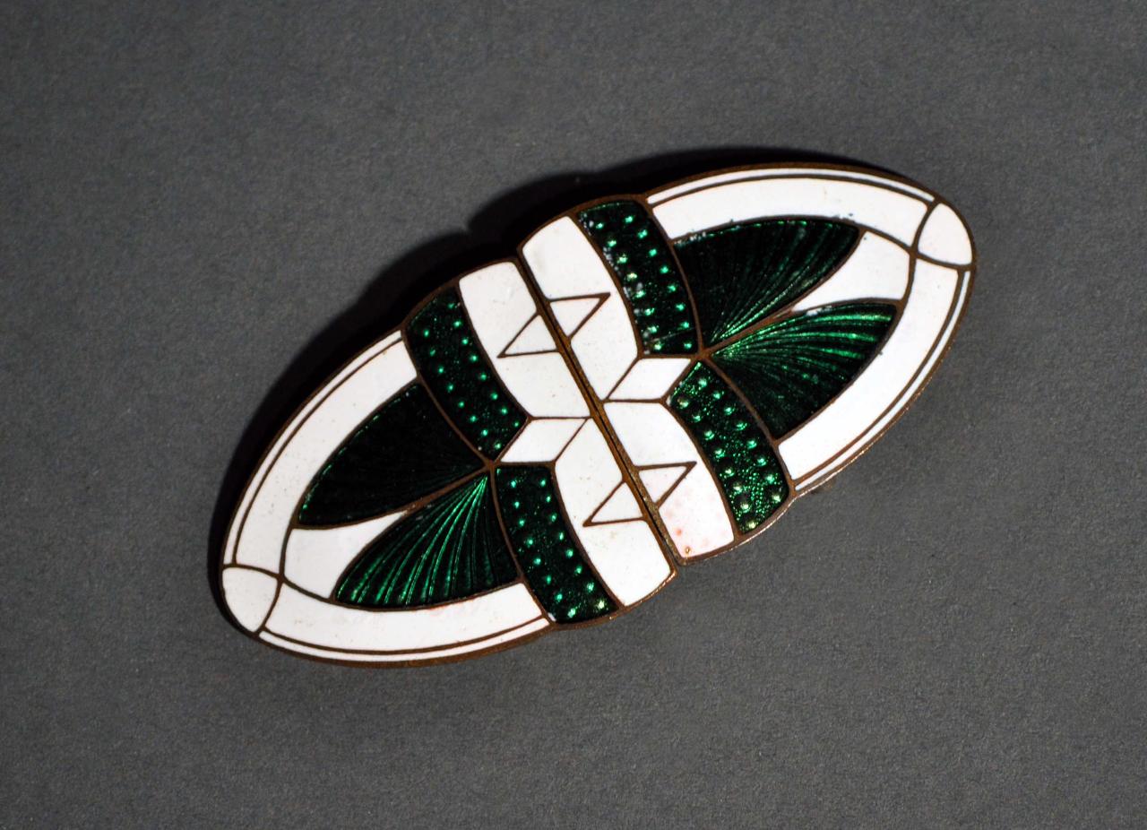 Fibbia a fermaglio da cintura, di forma composta. Corpo in bronzo argentato, in due pezzi. Ciascuno sagomato con profilo centinato, fascia esterna metallica, decorato a riserve geometriche delle quali quelle più esterne lavorate a smalto opaco bianco, quelle più interne lavorate a smalto a «basse taille» nei toni del verde su fondo operato a motivi ricordanti palmette stilizzate e doppie fasce perlinate. Passanti e ganci in bronzo argentato.