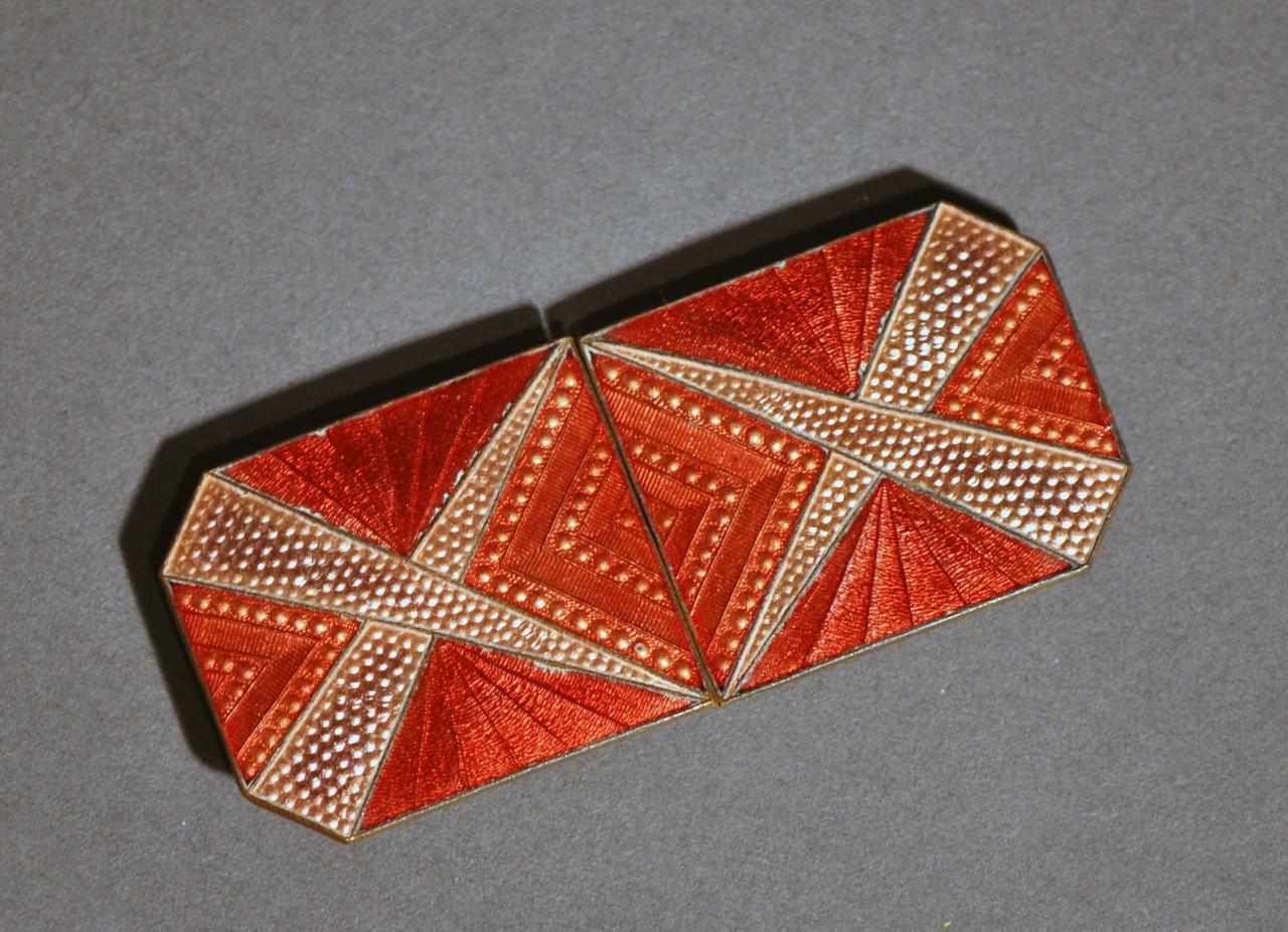 Fibbia a fermaglio da cintura, di forma composta. Corpo in metallo argentato, in due pezzi. Ciascuno sagomato a guisa di esagono irregolare, fascia esterna metallica, decorato a riserve geometriche trangolari lavorate a smalto a «basse taille» nei toni del rosso e del rosa antico su fondo operato a motivi a raggiera e a greche perlinate. Passanti e ganci in bronzo argentato.