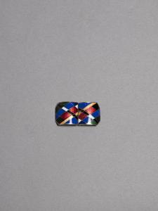 Fibbia a fermaglio da cintura, di forma composta. Corpo in metallo cromato, in due pezzi. Ciascuno esagonale leggermente convesso, con fascia esterna metallica liscia, decorato a riserve geometriche disposte a scacchiera irregolare, alcune lavorate a smalto a «basse taille» nei toni del verde, del rosso, dell'arancio e del turchese su fondo operato a rilievo, altre lavorate con smalto opaco blu, bianco e nero. Ganci in metallo cromato; quattro fori per fissare con viti i passanti. Sul retro della fibbia è presente la marcatura «MADE IN / CECHOSLOVAKIA».