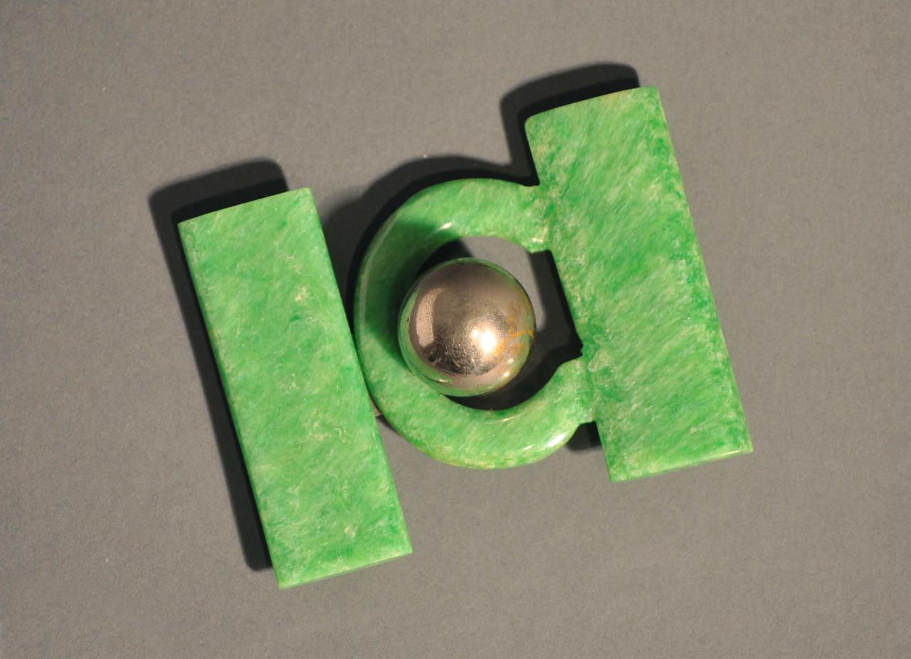 Fibbia a fermaglio da cintura, di forma composta. Corpo in galalite verde a imitazione della giada, in due pezzi. Uno decorato a traforo con fascia laterale rettangolare e "asola" in galalite; l'altro con fascia laterale rettangolare alla quale è fissata, con una piccola vite, una placca metallica liscia, sormontata da una sfera metallica che funge da elemento di raccordo e gancio di chiusura. Passanti in metallo cromato.