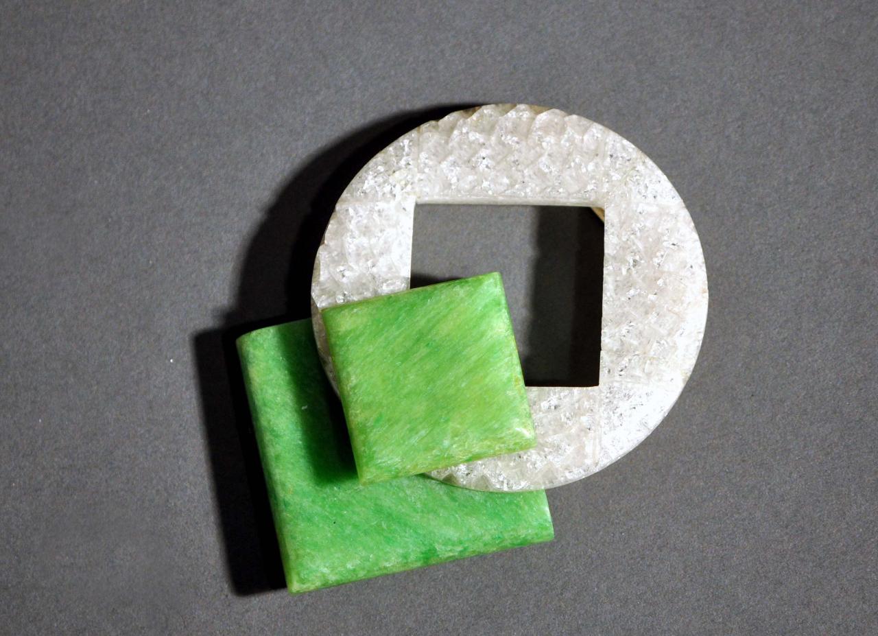 Fibbia a fermaglio da cintura, di forma composta. Corpo in galalite verde a imitazione della giada e in galalite trasparente a imitazione del cristallo, in due pezzi: uno di forma circolare, decorato a traforo, inciso e operato a imitazione del cristallo, l'altro formato da due rombi sovrapposti, dei quali il più piccolo, fissato con due viti, funge da elemento di raccordo e gancio di chiusura. Passanti in metallo cromato.