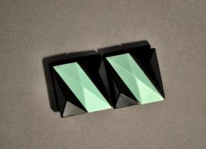 Fibbia a fermaglio da cintura, di forma composta. Corpo in galalite nera, in due pezzi. Ciascuno quadrato, decorato con tre placche in galalite nera e verde acqua tagliate e sfaccettate a imitazione di pietre dure. Passanti e ganci in metallo dorato.