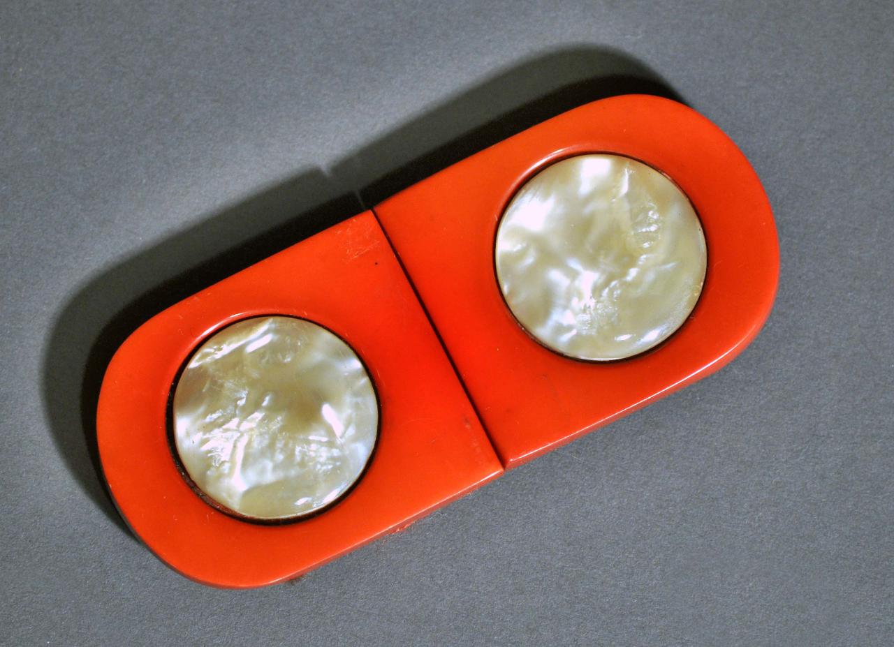 Fibbia a fermaglio da cintura, di forma composta. Corpo in galalite rosso corallo, in due pezzi. Ciascuno sagomato, liscio con applicazioni centrali incastonate in madreperla. Passanti ad anello in ottone e ganci in metallo.