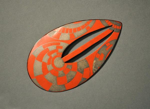 Passante da cintura decorativo, a forma di goccia. Corpo in metallo. Anello smaltato in rosso a motivi geometrici concentrici. Asola orizzontale, da un solo lato, entro lavorazione a traforo "a goccia". Retro smaltato in nero.