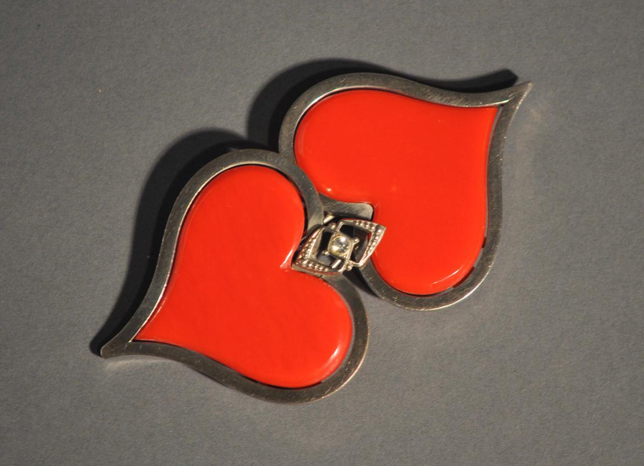 Fibbia a fermaglio da cintura, di forma composta. Corpo in metallo cromato, in due pezzi. Ciascuno a forma di cuore, lavorato a traforo, fascia esterna liscia, applicazione centrale in galalite rossa; elemento centrale di raccordo in metallo cromato, lavorato a traforo, a guisa di due rombi sovrapposti, con fascia laterale perlinata e strass centrale. Passanti e ganci in metallo cromato.