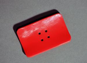 Bottone di forma quadrangolare, leggermente concava, con angoli smussati, in galalite rossa. Quattro fori centrali.
