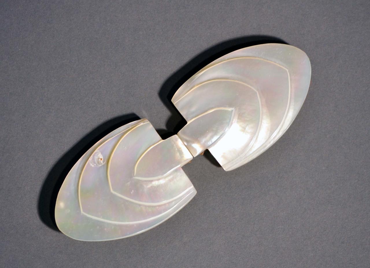Fibbia a fermaglio da cintura, di forma composta. Corpo in madreperla, in due pezzi. Ciascuno sagomato a forma di palmetta stilizzata e intagliato a creare forme cuspidate concentriche. Passanti e ganci in metallo cromato.